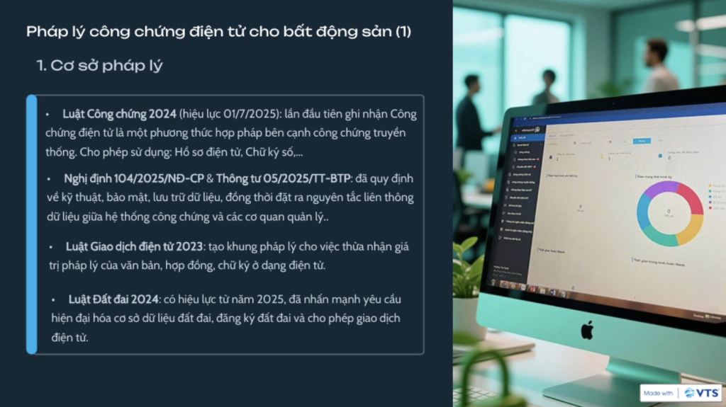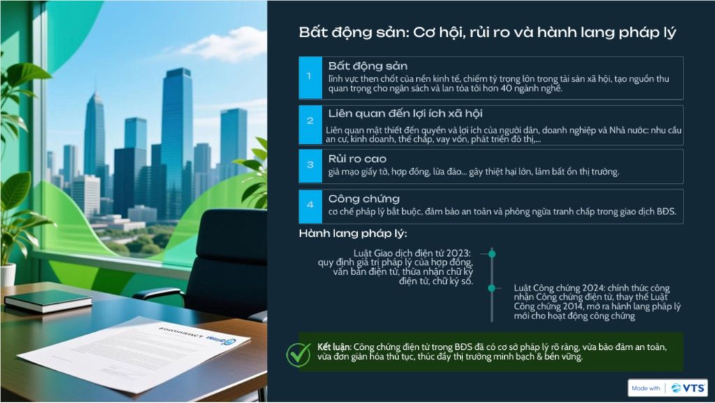 Như vậy, việc áp dụng công chứng điện tử trong lĩnh vực bất động sản không còn là câu chuyện xa vời mà đã có hành lang pháp lý rõ ràng để triển khai, đáp ứng yêu cầu vừa bảo đảm an toàn pháp lý, vừa đơn giản hóa thủ tục hành chính, và thúc đẩy thị trường bất động sản minh bạch, bền vững.