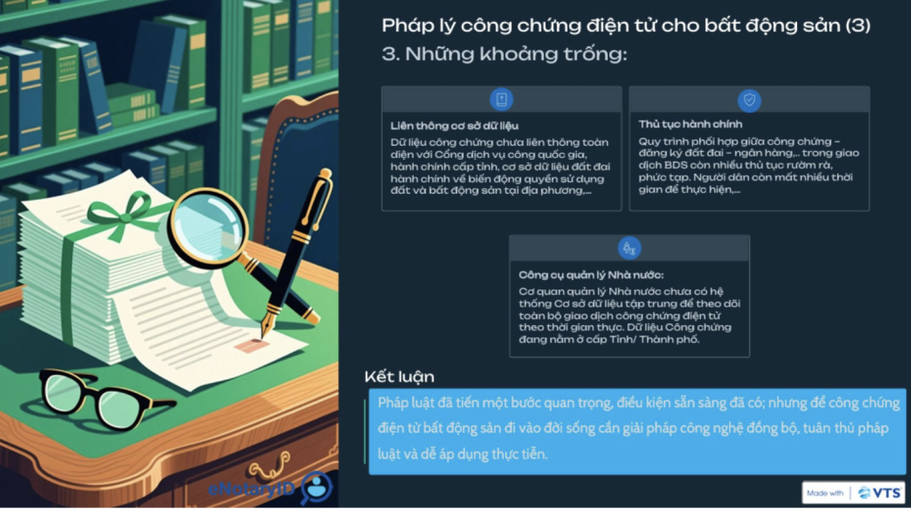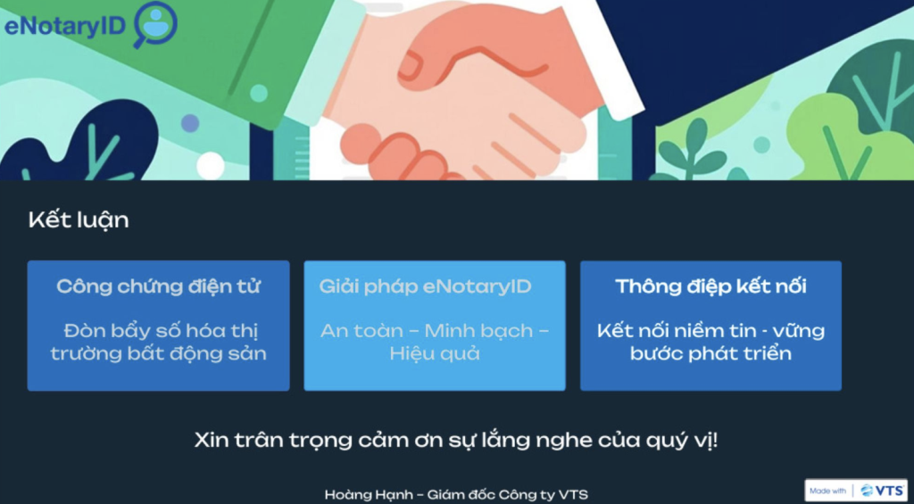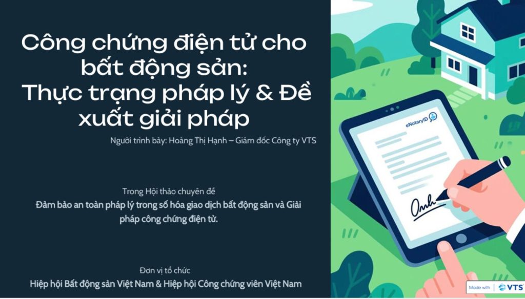 Tại Hội thảo, bà Hoàng Thị Hạnh, Giám đốc Công ty VTS đẫ trình bày chi tiết về thực trạng pháp lý trong công chứng điện tử cho bất động sản, một yếu tố không thể thiếu trong quá trình thực hiện giao dịch. Có thể nói, eNotaryID chính là cầu nối giữa cải cách hành chính, công nghệ số và sự an toàn pháp lý, góp phần tạo dựng một môi trường giao dịch bất động sản minh bạch, thuận lợi, và phù hợp với xu thế phát triển tất yếu của nền kinh tế số.