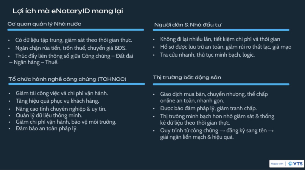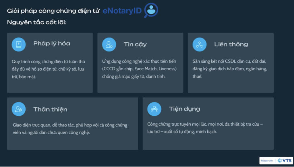 Nền tảng Công chứng điện tử eNotaryID là giải pháp mà VTS tin rằng không chỉ đáp ứng đầy đủ các yêu cầu pháp lý, mà còn mang lại trải nghiệm thuận lợi, tiết kiệm thời gian- chi phí, đặc biệt là mang lại sự an toàn cho người dân, doanh nghiệp và các tổ chức hành nghề công chứng.