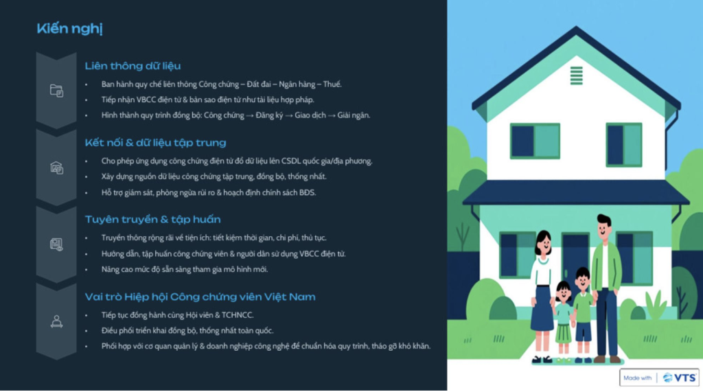 Cơ quan, tổ chức liên quan sớm ban hành quy chế liên thông dữ liệu đất đai – công chứng, coi đây là điều kiện then chốt để công chứng điện tử bất động sản khả thi. Cần ban hành cơ chế tiếp nhận và xử lý văn bản công chứng điện tử, bản sao điện tử như tài liệu hợp pháp trong hồ sơ hành chính và giao dịch. Phối hợp liên thông dữ liệu với hệ thống công chứng điện tử để tạo thành quy trình đồng bộ từ công chứng – đăng ký – giao dịch – giải ngân.